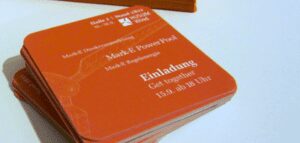 branding : gut auffallen : gewinnspielkarte : messestand : mark-e